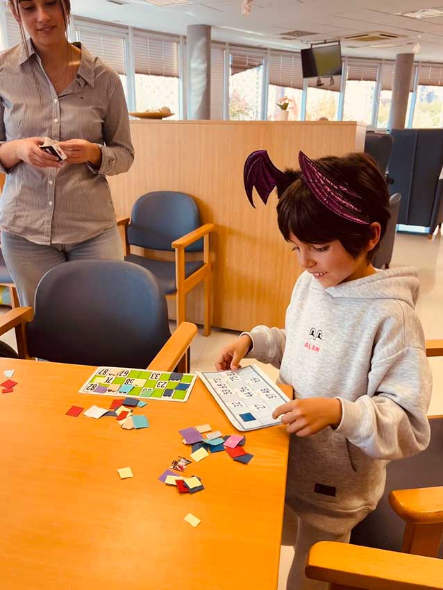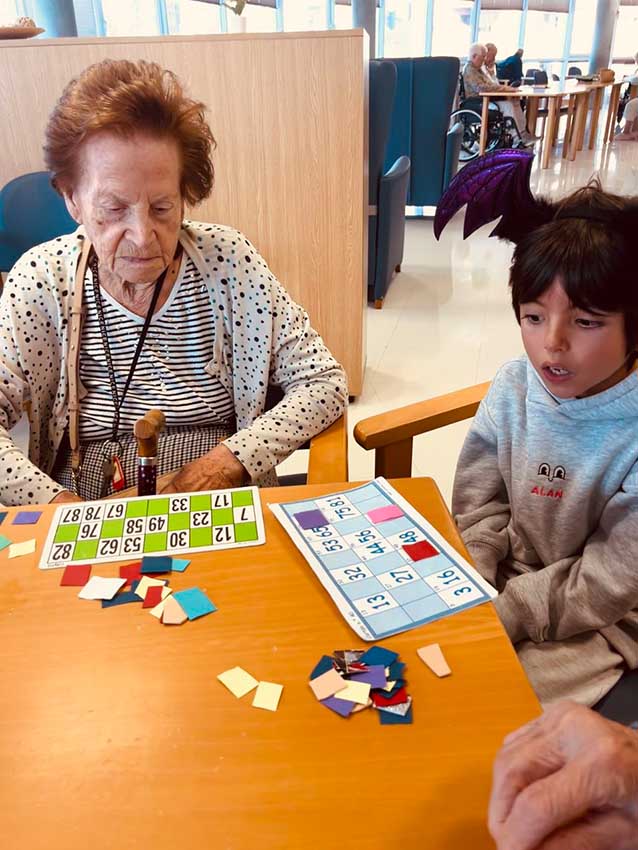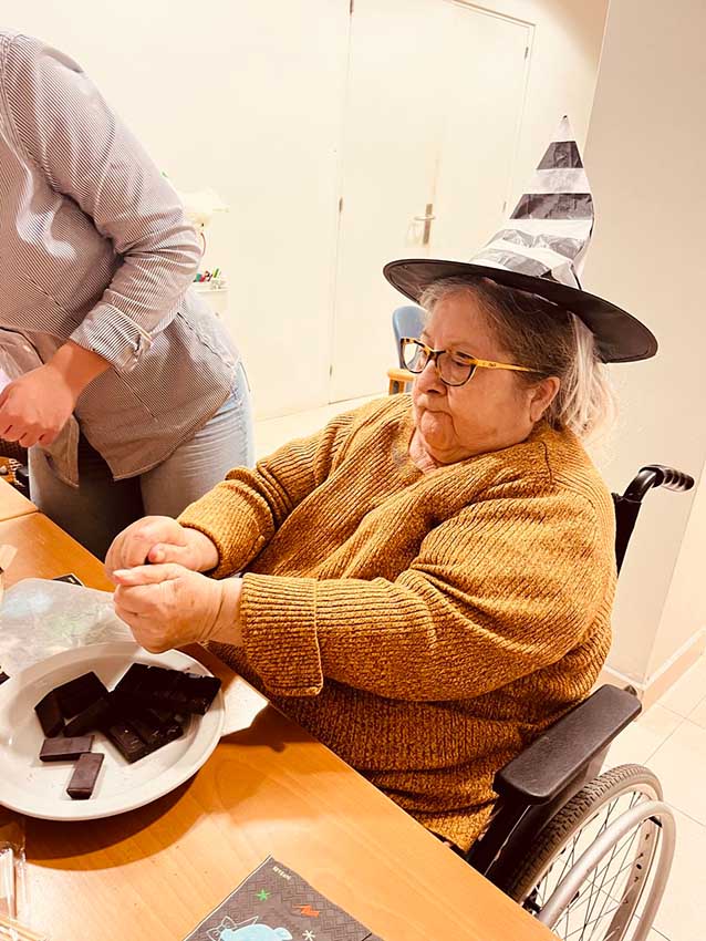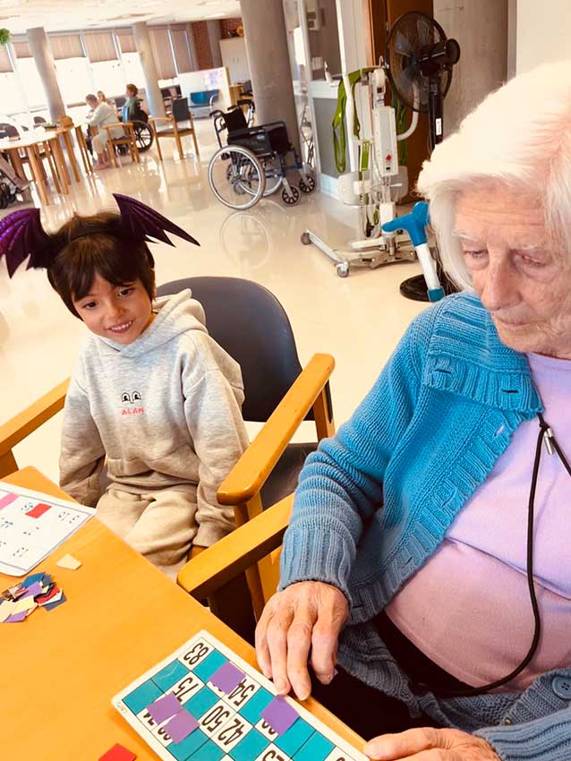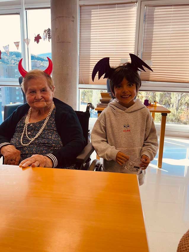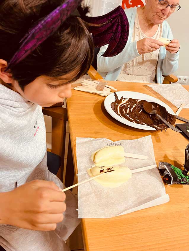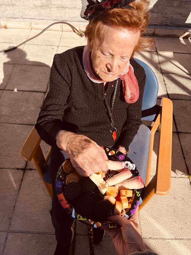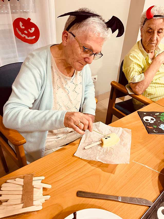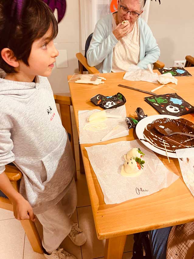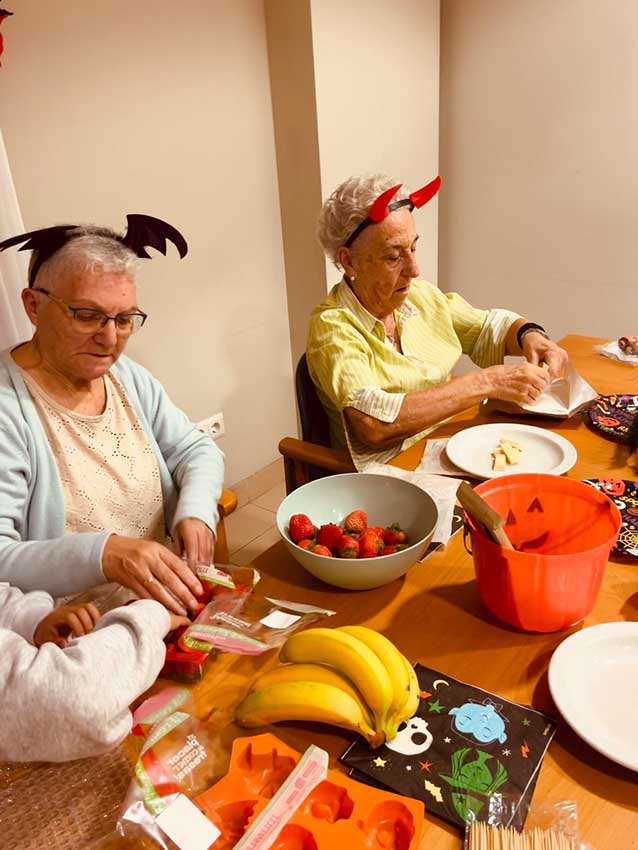 En la tercera planta, recibimos la visita de Alan, hijo de una de muestras monitoras y muy querido por todos los residentes. Alan participó en un original taller de cocina creativa con frutas y chocolate, en el que dimos forma a calabazas, fantasmas y otros personajes de Halloween. Más tarde, se puso al frente de un bingo temático, con premios sorpresa y muchas risas.